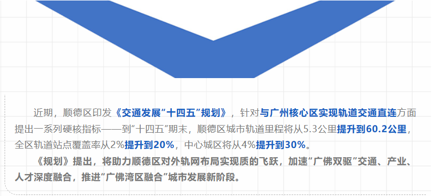 近期,顺德区印发《交通发展“十四五”规划》,针对与广州核心区实现轨道交通直连方面提出一系列硬核指标——到“十四五”期末,顺德区城市轨道里程将从5.3公里提升到60.2公里,全区轨道站点覆盖率从2%提升到20%,中心城区将从4%提升到30%。